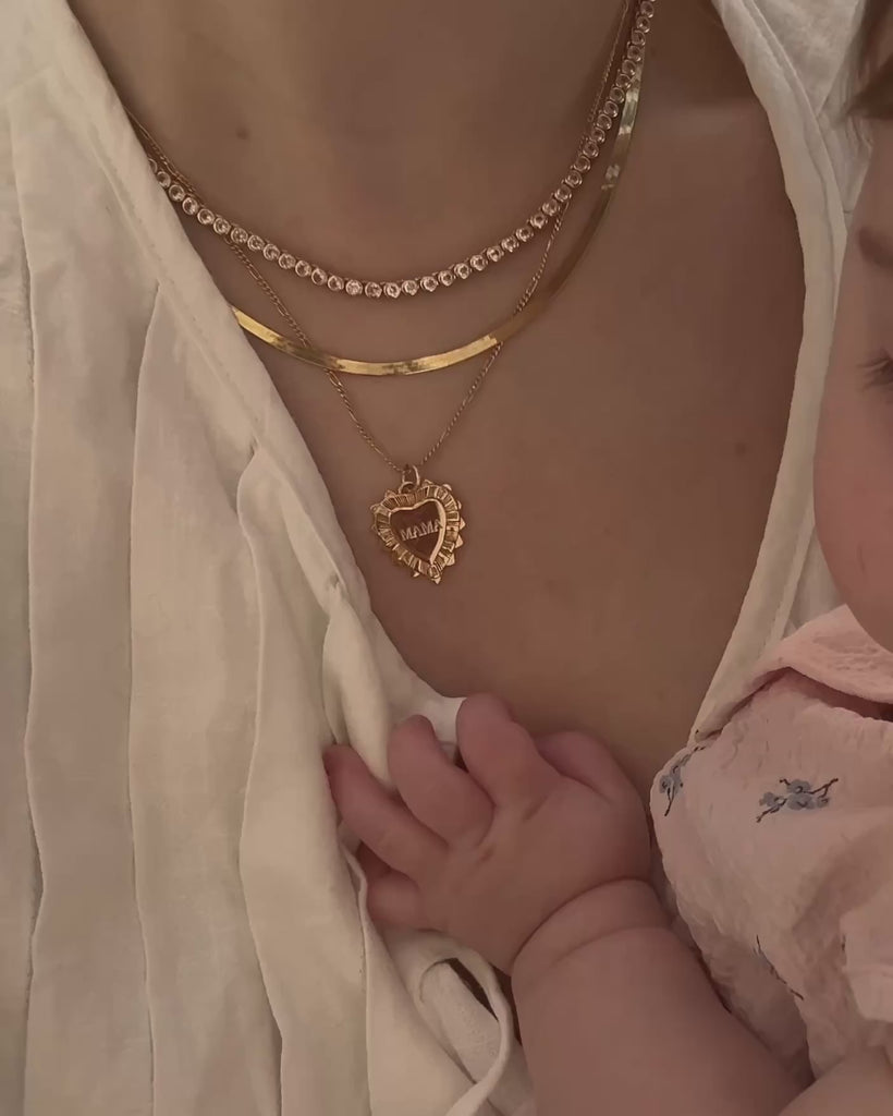 A heart pendant ringed with baguette crystals on a delicate link chain. Built for engraving—initials, coordinates, inside jokes, whatever matters. The kind of piece that means something without announcing it.